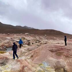 L'aprèm début par une sacrée montée en 4x4 qui nous emmène quasi à 5000m qui est un nouveau record pour le tribinôme. On y voit des geysers, des trous avec de la vapeur en réalité, et des marres de boue qui glougloutent comme dans l'âge de glace. Avec les geysers on a eu un tempête de neige ce qui rendait le moment très atypique.