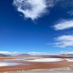 Depuis là on fait un aller-retour jusqu'aux laguna blanca et verde en passant par le désert Dali. Il s'appelle comme a cause des gros cailloux partout qui ont des formes cheloues. On croise plein de camions citernes remplis d'acide borique qui vont a fond dans le désert, on se croit dans mad max. Arrivés au lagunas blanco et verde on est au pied du volcan Llacancabur : c'est le point à l'extrême sud ouest de la Bolivie. Aujourd'hui on a de la chance, on a du soleil et du vent donc le laguna verde est vraiment vert c'est super beau. Sa couleur vient du fait qu'il y a un mélange d'espèces chimique dans son eau (notamment de l'arsenic) la rendant toxique.