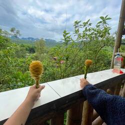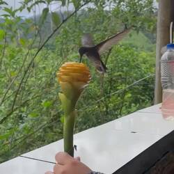 Heureusement lorsqu’on rentre a l’observatoire on a le droit de nourrir les colibris !!!! c’est trop super on tient dans la main une fleure qui fait office de mangeoire remplie de liquide sucré