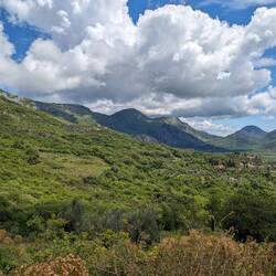 Later on, you carefully step along a stony trail hugging a ridge and come upon a pleasantly alpine spot. In the shadow of a stark outcrop, poppies and other little purple and yellow flowers bloom in through the flint. You follow signs for the remote church you want to find. You duck under low trees, and a silvery snake wriggles across your path, glinting in the sunlight. A few minutes later, through a gap in the canopy you see the terracotta roof of the church poking out across the valley.