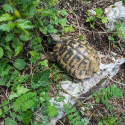 You clamber over dry-stone walls - or are they the exposed stone of the mountainside, tumbled and piled up without the aid of a human hand at all? Tadpoles sit in the mud, waiting for metamorphosis. You trek up behind the empty farmhouse, the abandoned millstone leaning in disrepair. A marvellous friend crosses your path, totally unexpectedly - a wild tortoise. You try to feed her a nearby fuzzy caterpillar, but she isn't hungry. Maybe that's her friend. She hurries to hide from me under a bush (taking her two minutes to travel approximately zero metres, of course). You leave her be.