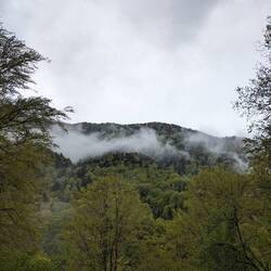 The bus stops at a rest area in a high mountain pass. Through the trees, you can see back in the direction of Skopje, although the city is hidden behind a range. The space between is almost-uninhabited, undisturbed mountain forest for miles and miles. Fat clouds hang low over the peaceful alpine scene.