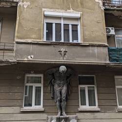 Marble columns, aspiring to the Acropolis, reveal themselves up close to be mouldering, decaying paeans to corrupt misappropriation of funds, fake monuments to a history claimed, yet not allowed to be owned. The country's magnificent endemic marble is sold off, and cheap knock-off stone is used here instead, so that N.Macedonia's own capital's monuments are rendered hollow, vacuous.