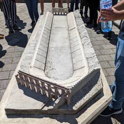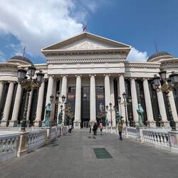 From a distance breathtaking; up close rotting. The bases of the columns are cracking and subsiding into the sandy riverbanks they were plonked down upon. A blonde middle-aged woman passes by you on your walking tour, and her figure casts the shadow of artifice and falsehoods. She heckles, insisting that everything your guide is saying is 'lies'. Who is she? A government worker, someone on the take from the ridiculous, brazen money laundering rackets all around our heads? Hers is an empty facade of power, like the stuccos of the casino, the museum. She implores you to believe not your own eyes, and what is clearly going wrong in the urban design of this place, and instead, believe that all of this is genuine, placed delicately and with historical accuracy. What? She and her kind cast themselves as the custodians of a long and glorious history, rather than the cynical architects of a kitsch anachronistic city. This is Skopje, real, because she says so.
