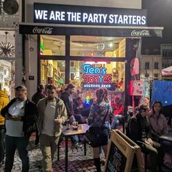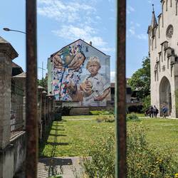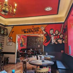 When the deluge is over, you head back out into the streets, past yellow, orange and blue walls, and find a red bar. Red, as in Soviet, as in Soviet-parody. You drink cocktails called 'Chernobyl' and 'Free Europe'. The wall behind your seat is wallpapered in a repeating pattern of matroyshka dolls, kitsch as hell, but you also want it for your own house.