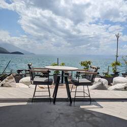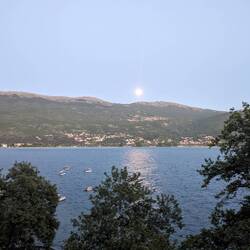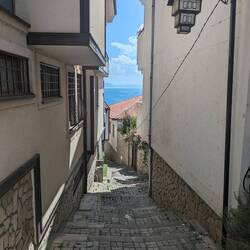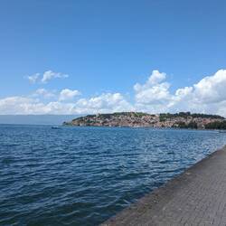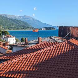 Rolling down from the mountains later, you pull into Ohrid. The lake is just out of sight, but you get a gorgeous first view when you arrive at your room. A large Macedonian flag is catching the breeze down by the water's edge, and you can see the placid blue water rippling beyond, and the mountains of Albania itself just a few miles away, across the lake. Once again, you are so close to that fabled country, but it eludes you still - for a little longer.