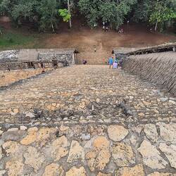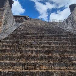 So, die letzten Maya-Ruinen in Mexiko besichtigt, und zwar in Ek Balam, knapp 30km nördlich von Valladolid. Hier auch wieder schön von Dschungel umgeben. Beeindruckendstes Gebäude ist hier dieLeggi altro