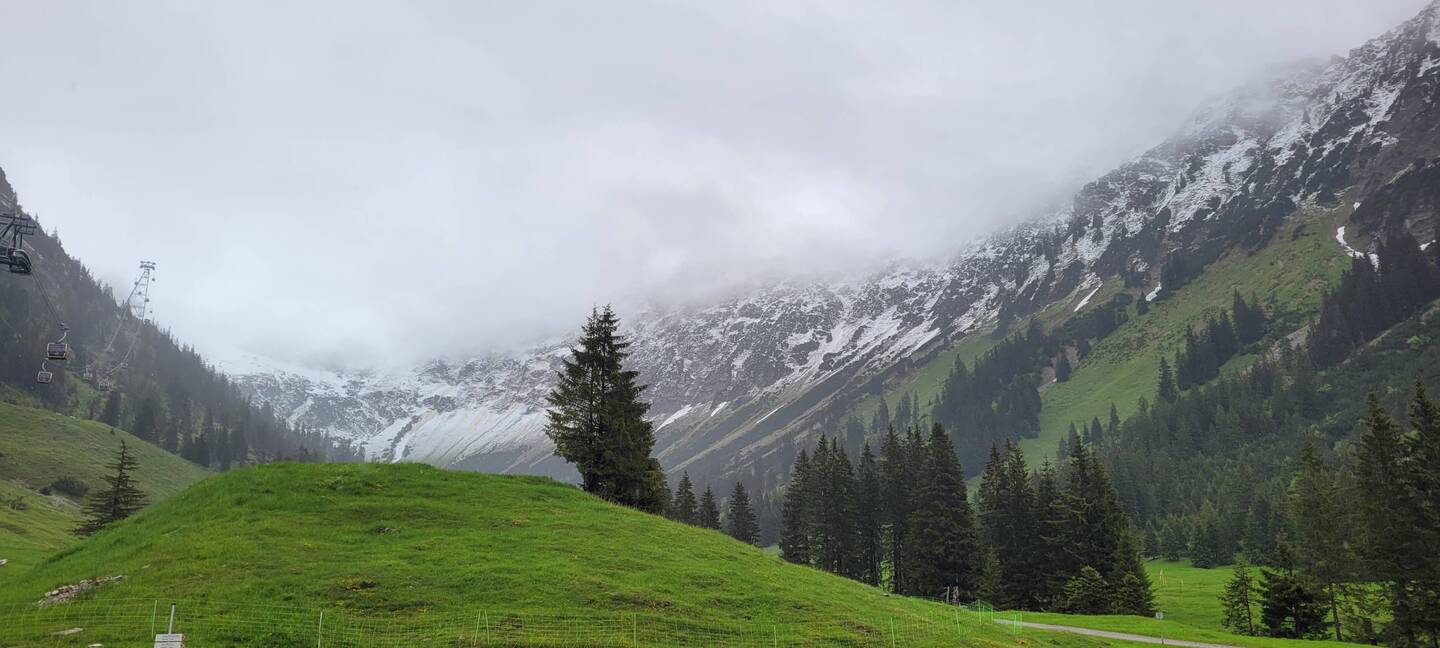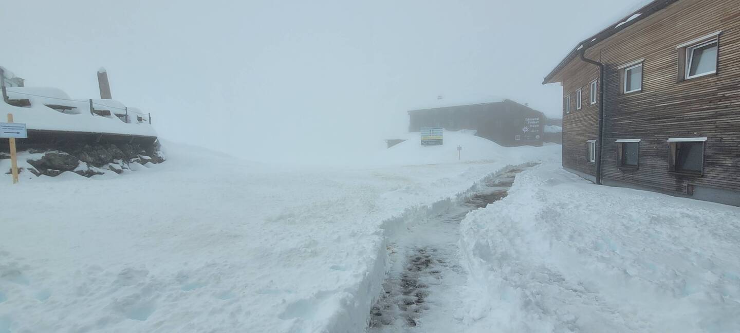 Unten im Tal seit gestern Dauerregen, und droben auf dem Berg jede Menge Neuschnee. Die Gipfelbahn aufs Nebelhorn hat auch ihren Dienst wieder eingestellt. Schön, aber irgendwie unpassend Anfang Juni.