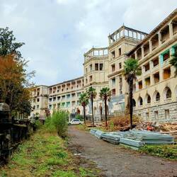 Heute besuchen wir den Kurort Tskaltubo, der nur eine kurze Fahrt nördlich von Kutaisi liegt. Zur Aufrechterhaltung der sozialistischen Arbeitskraft der Sowjetunion wurden hier ab 1939 Sanatorien und Erholungsheime im Stil des Neo-Klassizismus gebaut; in einer zweiten Hochphase folgten 1970 Gebäude der klassischen sowjetischen Moderne. Arbeiter der Sowjetstaaten konnten sich hier und in anderen Einrichtungen innerhalb des Staatenbundes zu privilegierten Bedingungen erholen und sich auch kulturell bereichern lassen.
