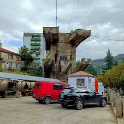 Weiter geht es dann nach Tschiatura selbst, einer Kleinstadt, die vor allem durch den Bergbau überlebt. Hier wird seit 1879 Manganerz abgebaut; vor dem 1. Weltkrieg war der Ort sogar das grösste Abbaugebiet der Welt. Für den Transport innerhalb des Ortes waren damals 26 Personen- und über 50 Materialseilbahnen verfügbar, von denen die letzten erst 2019 ausser Betrieb genommen wurden. Für Touristen wie uns ist das die eigentliche Anziehungskraft des Ortes. Für die Einwohner selbst gibt es inzwischen aber wieder eine moderne Anlage mit vier Seilbahnen im Zentrum, um schnell in die Wohngebiete an den Hängen zu kommen.