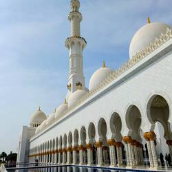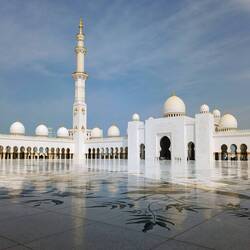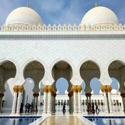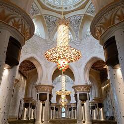 Das Gebäude, das vom inzwischen verstorbenen Scheich Zayid bin Sultan Al Nahyan in Auftrag gegeben wurde, hatte eine Bauzeit von rund zehn Jahren. Durch das grosse Tor kommen wir in den riesigen Innenhof und blicken auf die vielen Kuppeln und die Minarette. Gold und Marmor prägen diesen Bau und die Säulen sind Palmen nachgebildet. Die floralen Muster an den Säulen und auf dem Boden des Innenhofs sind nicht etwa aufgemalt, sondern aus verschiedenfarbigem Stein zusammengesetzt. Die Hauptgebetshalle ist besonders eindrücklich: Riesige Kronleuchter hängen hier über dem handgeknüpften Teppich. Die Wände sind ebenso reich verziert wie die Kuppeln unter der Decke.