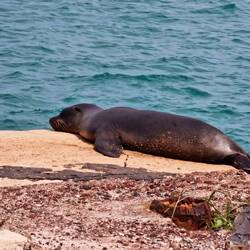 Als erstes gingen wir wieder den Ort erkunden und spazierten hier durch die Straßen. Neben dem Hafen lagen dann die ganzen Robben am Strand. Die Geräuschkulisse war super witzig. Jeder robbt über jeden einfach drüber und alle ärgern sich die ganze Zeit gegenseitig. Dass da natürlich viel gemeckert wird, ist klar. Die Kinder spielten die meiste Zeit im Wasser und ein dicker Seelöwe mischte immer wieder alles auf. Wir saßen eine ganze Weile hier und beobachteten sie. Dann liefen wir einmal zu Carola Beach und genossen die Sonne.