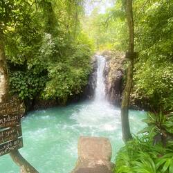 Hier schenkte Jack uns einen Kaffee ein und wir warteten gespannt, bis die Sonne hinter dem Vulkan und den vielen Wolken hervorkommt. Wow! Der Anblick war atemberaubend und ein Gefühl von vollkommener Zufriedenheit breitete sich in mir aus. Wir verbrachten fast zwei Stunden hier oben und ließen die Kulisse und die frische Luft auf uns wirken. Zurück in der Unterkunft frühstückten wir und packten unsere Sachen zusammen. Gegen zehn Uhr ging es weiter zu einem Wasserfall mit vielen kleinen Pools. Auch hier ging es erstmal viele Stufen hoch und die Natur war unglaublich schön.