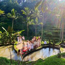 Am ersten Tag fand eine Anfangszeremonie statt. Hier mussten wir uns alle weiß kleiden und bekamen ein Canang Sari in die Hand. Dann sollten wir uns in einer Reihe alle bei den Nachbarn einhaken und gingen so gemeinsam hinunter zum Fluss. Hier ließen wir nacheinander das Canang Sari in den Fluss schwimmen.