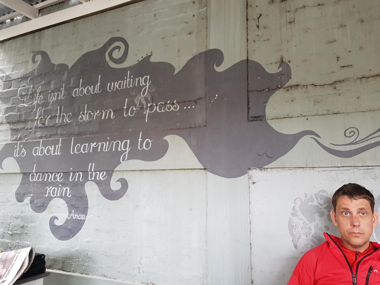 Tijdens het ontbijt wachten we tot de regenbui wat minder wordt. In tegenstelling wat de spreuk op de muur zegt.