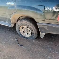 La route est caillouteuse et on traverse beaucoup de rivière, heureusement que nous sommes dans un 4x4. La roue n'a quand même pas résisté et a crevé... la deuxième fois en 10 jours ! 🏞️