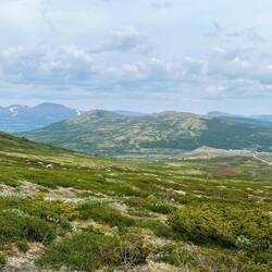 Ab Dombas geht die E6 stetig bergauf und führt durchs Dovrefjell. Richtung Oppdal ziehen sich zu beiden Seiten Bergketten und Seen. Der Himmel hat sich etwas verdunkelt.