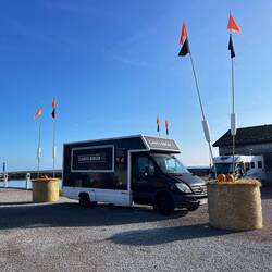 Fischgeschäft, Restaurant und Hafencafe, die sowieso schon immer hier sind, haben als Deko verschiedene Zierkürbisse und Strohballen aufgestellt.