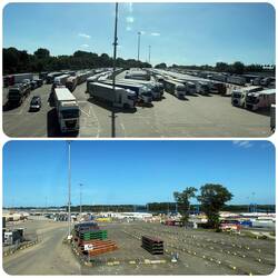 Am frühen Nachmittag verlassen wir den Stellplatz und stellen uns kurz vor dem Fährareal in ein schattiges Wäldchen zu einigen auch wartenden LKW‘s.