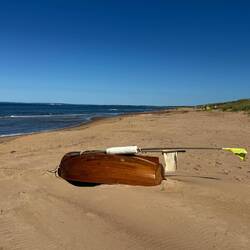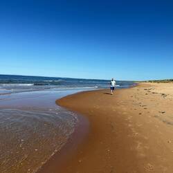 Um überhaupt einmal bis ans Wasser vordringen zu können, müssen wir zuerst durch den Hinterausgang des CP’s, spazieren da auf einem sandigen Trampelpfad durch ein Wäldchen und stehen dann vor einer hohen Düne die es auch noch zu erklimmen gilt.