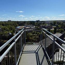 Hier überqueren wir eine Hängebrücke über den „Göta älv“. Auf der anderen Seite des Flusses klettern wir über einen steilen Pfad, wo noch zusätzlich jenste Treppen eingebaut wurden, nach oben, wo wir irgendwann zum atemberaubenden Aussichtspunkt „Kopparklinten“ gelangen, eine Plattform in den Felsen hoch über Trollhättan. Etwas darunter hängt ein kleiner Skywalk ins Nichts. Wenn auch klein, trotzdem nicht jedermanns Sache 🫣