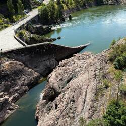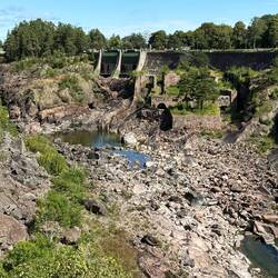 Nun…von wegen Wasserfall…momentan liegt eine felsige Schlucht vor uns, ohne tosenden Wasserfall! Ja… hat natürlich auch seinen Grund; anstelle die Dammtore des Flusses Göta Älv einfach zu öffnen und dann bis zu 300’000 Liter Wasser in der Sekunde die 30 Meter hohen Felsen hinunter schiessen zu lassen, leitet man das kostbare Nass lieber durch die Turbinen und produziert damit Strom.