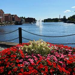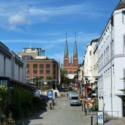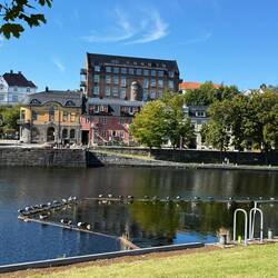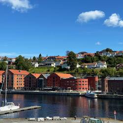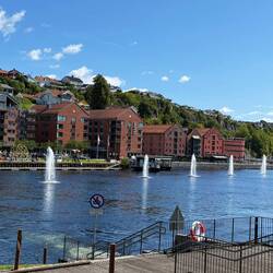 Von da oben haben wir einen schönen Ausblick auf einen Teil der Stadt, auf die Einkaufsstrasse, die Kirche von 1894 und den See „Skienselva“. Hier befördert die letzte Schleuse Schiffe und Boote 5 Meter weiter nach unten, wo sie nur noch eine kurze Fahrt bis in die Nordsee haben.