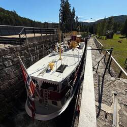 Wir haben Glück und das Schiff „MS Victoria“ (Königin des Kanals von 1882) von Skien herkommend, wird gerade nach oben geschleust.
