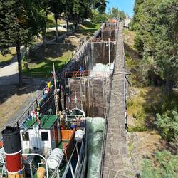 In drei Kammern, noch mit Holztoren, werden die Schiffe knapp 11 Meter nach oben befördert.
