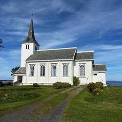 Danach strampeln wir in die entgegengesetzte Richtung bis nach Hopen. Schauen uns die weisse Holzkirche von 1892 an (natürlich geschlossen), entdecken ein Denkmal für Oscar Emil Tybring (1847–1895). Er war der Gründer der norwegischen Seerettungsgesellschaft an der Küste.