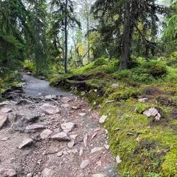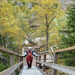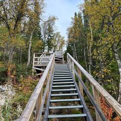 Nach dem Regen geht’s weiter. Kurz vor dem Wasserfall führen etliche Stufen in den Talkessel, unten angekommen, überqueren wir eine Brücke, um dann auf der anderen Seite des Flusses einem Holzsteg zu folgen bis fast unter Schwedens höchsten Wasserfall, den Njupeskär.