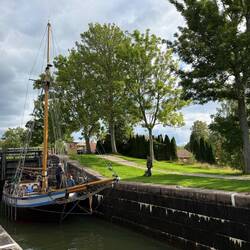 Gerade…wie wir mit den Velos in Sjötorp an die letzte Schleuse vor dem See fahren, wird die Schaluppe Oskar II in den Vänernsee geschleust.