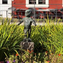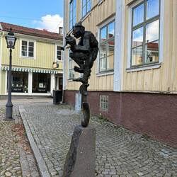 Nach knapp 500 Meter stehen wir mitten im historischen Stadtzentrum, einerseits am grossen Marktplatz mit einer Reiterstatue zum Gedenken an die Auflösung des Königlichen Småland-Husarenregiments im Jahr 1927 und andererseits bei der Kirche von 1889.