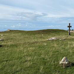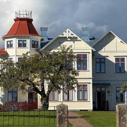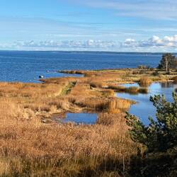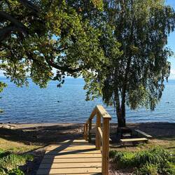 Weiter geht’s zur Kirche von 1895, und dann, weil wir ja sportlich aussehen wollen, 240 Stufen hinauf auf den Grännaberget. Oben erwartet uns ein Freiluftmuseum, aber vor allem ein grandioser Blick über den Vätternsee und die Insel Visingsö.