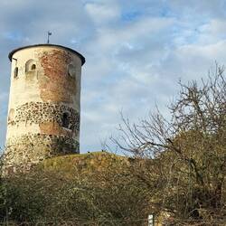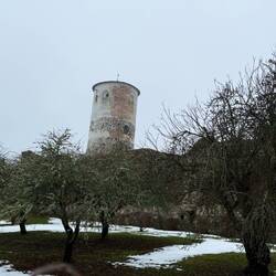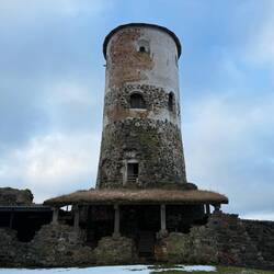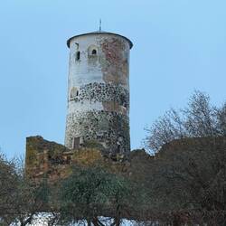 Im beeindruckenden Rundturm steigen wir über neu errichtete Holztreppen bis etwa zur Mitte hinauf und finden uns unvermittelt in einem inoffiziellen Taubenschlag wieder, von wo wir einen schönen Ausblick haben.