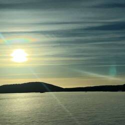 Über dem hellgelben Sonnenaufgang ist der Himmel blau? grau? blaugrau?