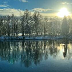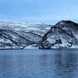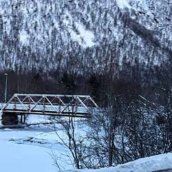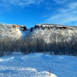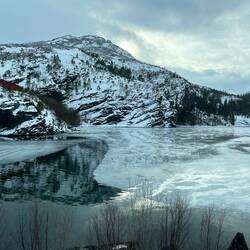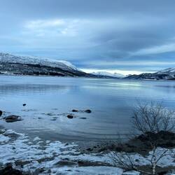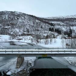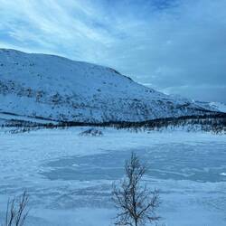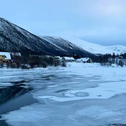 Am Ende des Sees der wie alle anderen Gewässer dick zugefroren ist, also beim Abfluss, fliesst der Fluss Altaelva der Strasse entlang durch eine enge und kurvige Schlucht, zwischen steil aufsteigenden Felsen runter Richtung Alta wo er dann im Altafjord mündet.