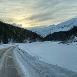 Schnee liegt noch in Hülle und Fülle aber die Strasse ist relativ sauber.