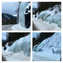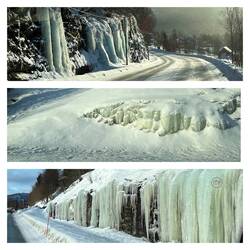 Normalerweise rauscht hier der Fluss zu Tale, jetzt im tiefsten Winter fliesst ein nur wenig sichtbares Rinnsal unter dicken Eisplatten durch das Gestein.