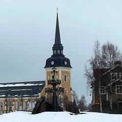 Karesuando, 310 Einwohner, ist ein Grenzort auf der schwedischen Seite des Grenzflusses Muonioälv. Hier fahren wir heute an Schwedens nördlichster Kirche von 1905 vorbei. Über eine der wenigen Brücken erreichen wir auf der anderen Seite des Flusses das finnische Karesuvanto mit 140 Einwohner.
