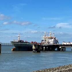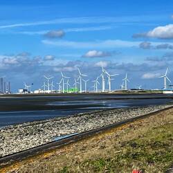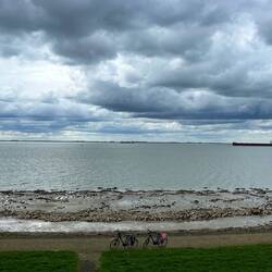 Wir parken die Velos und steigen auf den Deich. Da haben wir wieder einen super Weitblick, einerseits über die Westschelde wo reger Schiffsverkehr stattfindet und andererseits übers fast verträumte Poldernland.