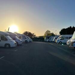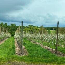 Die Plätze sind mit Birnenbäumchen abgetrennt, das Parkfeld ist gekiest und im benachbarten Feld rennen wieder Fasane rum 😍