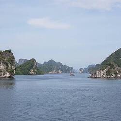 Ao día seguinte recolléronnos na porta do hotel ás 8 da mañá. Despois de pouco menos de 4 horas de viaxe chegamos a Halong e despois dun té xeado asignáronnos unha cabina no noso barco. Polo que puidemos ver na baía e polo que nos contaron os tripulantes, cada naviera ten dous barcos, a versión clásica para aqueles que queremos unha viaxe máis tranquila, e a versión de festa na que os mozos norteamericanos demostran a súa virilidade berrando e bebendo cervexa. O que máis me molestou foi que nos incluíron no grupo de puretas sen preguntar as nosas preferencias. A verdade é que o barco estaba estupendo, a comida era espectacular e o plan de actividades moi correcto: andamos en kaiak, bañámonos na baía, déronnos unha clase de cociña vietnamita, pescamos luras, había tai chi de madrugada e fixemos unha ruta pola xigantesca cova de Sung Sot. Lera en moitos sitios que nos barcos máis baratos a hixiene non é o prato forte e moitas queixas por roubos e estafas nos cruceiros.