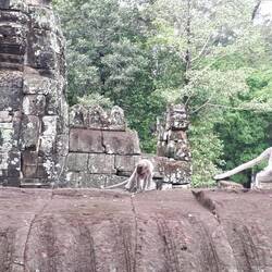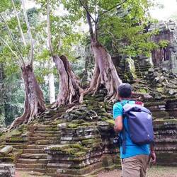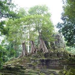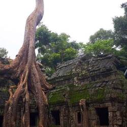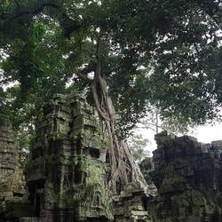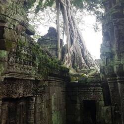 Despois dunha pequena visita a Ta Kheo, actualmente en proceso de reconstrución, chegamos a Ta Prohm. Despois de ver o minucioso traballo na reconstrución de Ta Kheo, a beleza da natureza destruíndo e conquistando Ta Prohm abre o debate sobre cal sería a mellor forma de conservalo. Quizais sexa necesaria a reconstrución para coñecer a historia, pero esa natureza salvaxe, gañando a partida ao home, son imaxes indelebles, unha marabilla. Comezaba a chover e o encanto era aínda maior. Para chegar ao templo hai que dar un paseo de aproximadamente 1 km por un camiño pola selva e o templo non é excesivamente grande (en dúas horas xa verás todo). Agora chovía moito polo que non se podía facer unha visita a Bantheay Srei (din que os relevos do templo das mulleres son os máis fermosos de todo o complexo). De feito fixemos unha última parada en Bantheay Kdei pero chovía tanto, estabamos tan cansos e con fame que non pasamos máis de 30 minutos nel.
