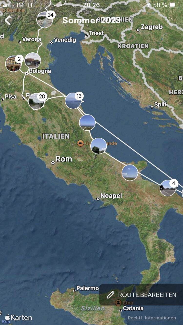 Die heutige Tour: Von rechts der 4 (Bari), an Land über die 13, bis zur 2 (Correggio)
