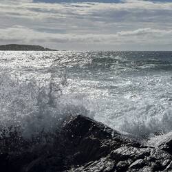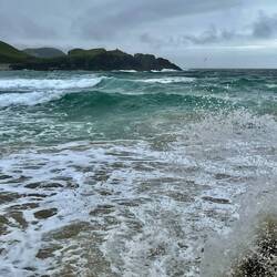 Unterwegs halten wir am Ardroil Beach und machen im Nieselregen einen ausgedehnten Strandspaziergang. Wir fahren weiter und machen noch einen weiteren Abstecher zum Mangurstadh Beach. Hier hört es auf zu nieseln und es wird heller. Wir genießen die hohen Wellen und den Wind.