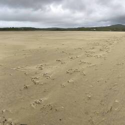 Trotz des Nebels sind wir zum Seilebost Strand gefahren. Der Strand ist über die A859 zu erreichen. Seilebost liegt auf einer Landzunge, die nördlich des gleichnamigen kleinen Dorfes ins Meer ragt. Der Zugang zum Strand ist von der Straße aus etwas schwierig, aber wer bereit ist, sich die Mühe zu machen, wird damit belohnt, dass er dieses kleine Stückchen Paradies vielleicht ganz für sich allein hat. Er ist auch ohne Sonne sehr beeindruckend groß und unheimlich lang - und wurde einmal zu einem der 10 besten Strände der Welt gewählt. Von hier aus hat man einen Blick auf Taransay und Ben Luskentyre.