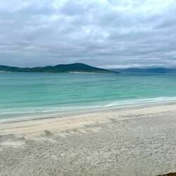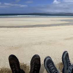 Anna hatte uns Scarista Beach empfohlen, für sie der schönste Strand auf Harris. Das ist Karibikfeeling (allerdings mit Bergsee-Wassertemperatur). Wie an allen dieser wunderbaren Stränden auf Harris, ist man meistens fast alleine! Wir laufen nach links bis zum Ende, danach nach rechts bis zum Ende, wo uns aber dann doch die Füße langsam wehtun. Der Strand ist einfach zu lang (3.5km) und so legen wir uns einfach in den Sand. Ja - wir sind an einem entlegenen Strand auf Harris - aber wir haben 5G - daher klappt es auch mit FaceTime die Kinder in Deutschland an unserem Glück teilhaben zu lassen.