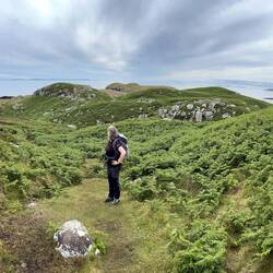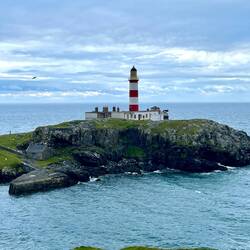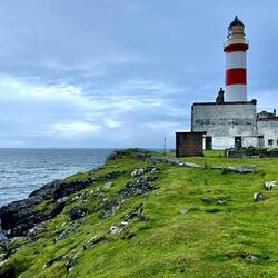 Nun, heute haben wir mal wieder geschwitzt.... ;-) Nach dem Frühstück und einem langen Schwatz mit Margarete (Katrin war ganz begeistert von ihren drei Boston Terriers) haben wir unsere Rucksäcke gepackt und haben uns auf den Weg gemacht, einmal die Insel zu umrunden. Wir sind kaum aus dem Ort heraus, da machen wir eine lustige Entdeckung. Direkt am See wurde ein Stück zu einem Ankerplatz bzw. Bootsanlegeplatz betoniert. Da muss sich wohl jemand nackig in den feuchten Beton gelegt haben … 🤣 Es gibt hier keine richtigen Wege, sondern nur Markierungen (Pfähle) in Sichtweite zueinander. Dazwischen ist nur Felsen, Heidekraut und Moor. Durch den Regen der letzten Tage sind die Wege ziemlich nass und man muss aufpassen, dass man nicht versinkt. So haben wir uns auf den höchsten Punkt unserer Wanderung, den 104 m hohen Beinn Sgorabhaig gekämpft. Von hier oben haben wir wieder einen schönen Blick auf den Eilean Glas Leuchtturm. Es geht wieder bergab und wir kreuzen den Weg von gestern Abend. Vorbei am Leuchtturm machen wir auf einer Anhöhe eine längere Rast, beobachten ein Boot mit Touristen.