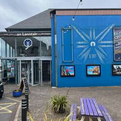 In Stornoway (Lewis) angekommen, fing es auch wirklich zu regnen an, es war aber nur ein kurzer Schauer. Wir möchten etwas essen und landen im "An Lanntair" - ein schöner Glasbau gegenüber des Hafens, ein Arts Centre mit Cafe und Bistro. Eine Suppe und ein Toastie sind perfekt und sehr lecker. Solche Community Center vermisse ich bei uns in der ländlichen Gegend. Hier treffen sich die Renter, hier trifft sich die Jugend - für die es ein "Student Meal Deal" gibt: ein Sandwich oder Suppe, ein Softdrink oder einen Pott Tee und einen Schokoriegel oder Crisps - alles zusammen für unglaubliche 5 Pfund.